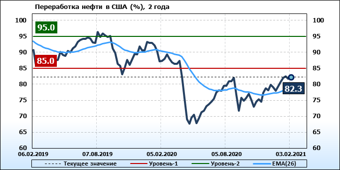 Добыча нефти не изменилась и составляет 10.9 млн. баррелей в день. Импорт нефти вырос на 1.443 до 6.507 млн. баррелей в день. Экспорт нефти вырос на 0.128 до 3.483 млн. баррелей в день. Таким образом, чистый импорт нефти вырос на 1.315 до 3.024 млн. баррелей в день. Переработка нефти выросла на 0.6 до 82.3 процента.