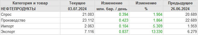 Спрос на нефтепродукты вырос на 0.394 до 21.083 млн. баррелей. Производство нефтепродуктов выросло на 0.423 до 23.112 млн. баррелей. Импорт нефтепродуктов вырос на 0.104 до 2.063 млн. баррелей. Экспорт нефтепродуктов вырос на 0.837 до 7.116 млн. баррелей в день.