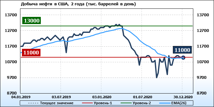 Сегодня, 30 декабря 2020 года, нефтегазовая сервисная компания Baker Hughes сообщила, что на неделю 24-30 декабря 2020 года количество действующих буровых установок по добыче нефти в США увеличилось на 3 штуки — до 267 штук (+1,1%), в очередной раз обновив максимум с начала мая этого года, в то время как в Канаде упало 13 штук — до 18 штук (-41,9%). Количество буровых установок по добыче газа в США не изменилось, оставшись на уровне 83 штуки (0,0%), в то время как в Канаде упало 10 штук — до 41 штуки (-19,6%). Общее количество буровых в США с учетом многоцелевых установок за неделю 24-30 декабря увеличилось на 3 штуки — до 351 штуки (+0,9%), а в Канаде упало на 23 штуки — до 59 штук (-28,0%). В США рост был зафиксирован в штатах Техасе (+2 установки) и Оклахома (+1), снижение не наблюдалось ни в одном штате.