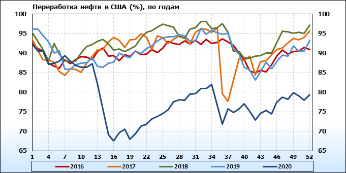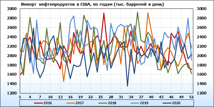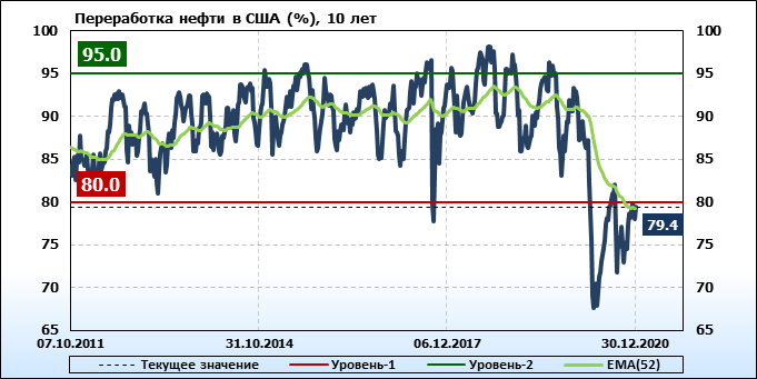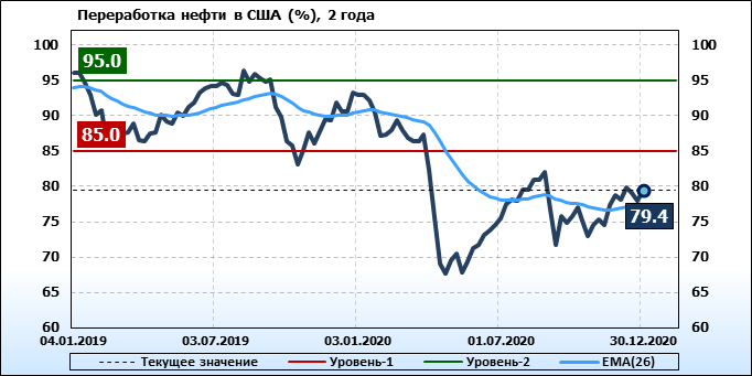 Добыча нефти не изменилась и составляет 11 млн. баррелей в день. Импорт нефти упал на -0.238 до 5.326 млн. баррелей в день. Экспорт нефти вырос на 0.526 до 3.625 млн. баррелей в день. Таким образом, чистый импорт нефти упал на -0.764 до 1.701 млн. баррелей в день. Переработка нефти выросла на 1.4 до 79.4 процента.