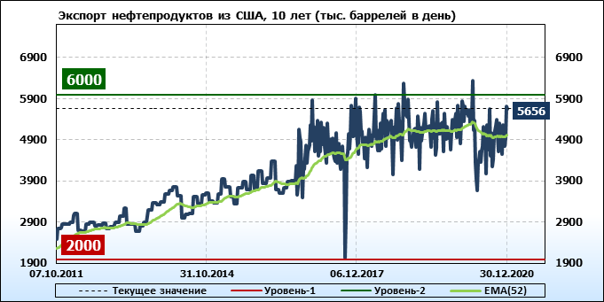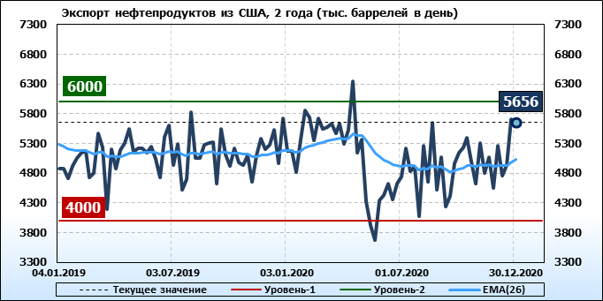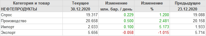 Спрос на нефтепродукты вырос на 0.229 до 19.317 млн. баррелей. Производство нефтепродуктов выросло на 0.5 до 20.658199 млн. баррелей. Импорт нефтепродуктов вырос на 0.1 до 2.033 млн. баррелей. Экспорт нефтепродуктов упал на -0.058 до 5.656 млн. баррелей в день.