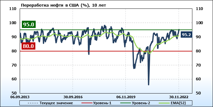 Добыча нефти не изменилась и составляет 12.1 млн. баррелей в день. Импорт нефти упал на -1.026 до 6.037 млн. баррелей в день. Экспорт нефти вырос на 0.706 до 4.948 млн. баррелей в день. Таким образом, чистый импорт нефти упал на -1.732 до 1.089 млн. баррелей в день. Переработка нефти выросла на 1.3 до 95.2 процента.