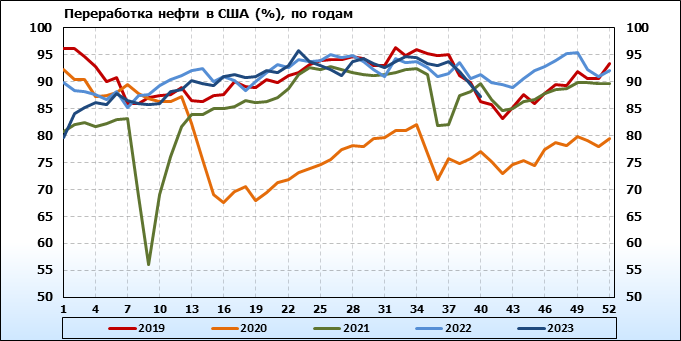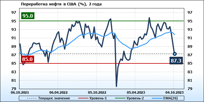 Добыча нефти не изменилась и составляет 12.9 млн. баррелей в день. Импорт нефти упал на -1.014 до 6.215 млн. баррелей в день. Экспорт нефти вырос на 0.944 до 4.956 млн. баррелей в день. Таким образом, чистый импорт нефти упал на -1.958 до 1.259 млн. баррелей в день. Переработка нефти упала на -2.2 до 87.3 процента.