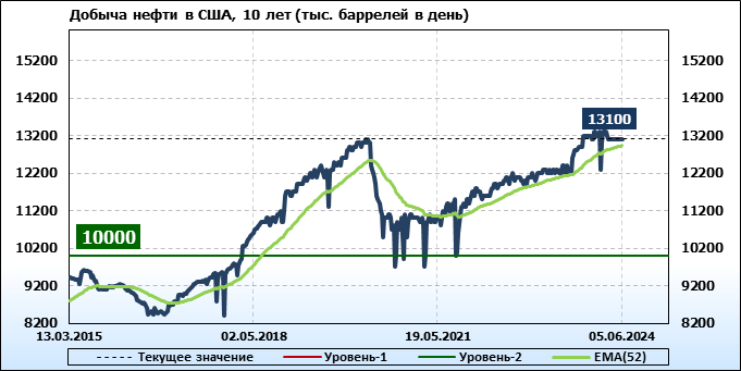 В среднем за последние четыре недели добыча нефти в США также составила 13,1 миллиона баррелей в сутки, сказано в обзоре.