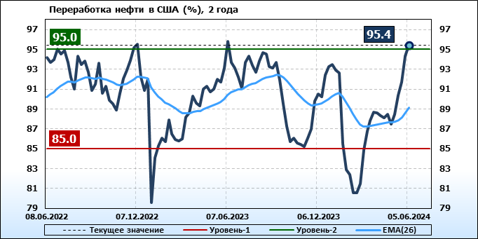 Добыча нефти не изменилась и составляет 13.1 млн. баррелей в день. Импорт нефти вырос на 0.289 до 7.058 млн. баррелей в день. Экспорт нефти вырос на 0.276 до 4.501 млн. баррелей в день. Таким образом, чистый импорт нефти вырос на 0.013 до 2.557 млн. баррелей в день. Переработка нефти выросла на 1.1 до 95.4 процента.