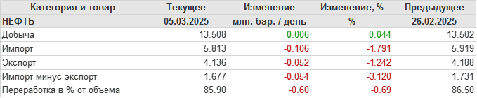 EIA. Добыча, импорт, экспорт нефти в США на 5 марта 2025