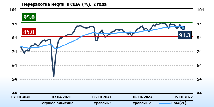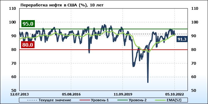 Добыча нефти не изменилась и составляет 12 млн. баррелей в день. Импорт нефти упал на -0.502 до 5.947 млн. баррелей в день. Экспорт нефти упал на -0.095 до 4.551 млн. баррелей в день. Таким образом, чистый импорт нефти упал на -0.407 до 1.396 млн. баррелей в день. Переработка нефти выросла на 0.7 до 91.3 процента.