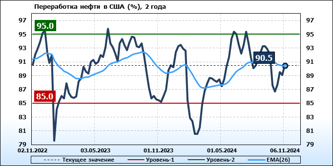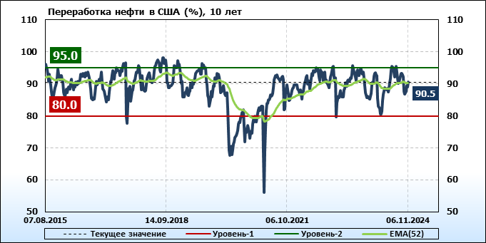 Добыча нефти не изменилась и составляет 13.5 млн. баррелей в день. Импорт нефти вырос на 0.265 до 6.24 млн. баррелей в день. Экспорт нефти упал на -1.411 до 2.85 млн. баррелей в день. Таким образом, чистый импорт нефти вырос на 1.676 до 3.39 млн. баррелей в день. Переработка нефти выросла на 1.4 до 90.5 процента.