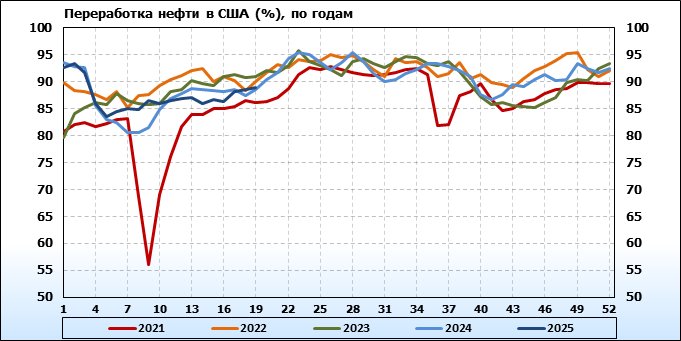 Добыча нефти упала на -0.098 до 13.367 млн. баррелей в день. Импорт нефти вырос на 0.558 до 6.056 млн. баррелей в день. Экспорт нефти упал на -0.115 до 4.006 млн. баррелей в день. Таким образом, чистый импорт нефти вырос на 0.673 до 2.05 млн. баррелей в день. Переработка нефти выросла на 0.4 до 89 процента.