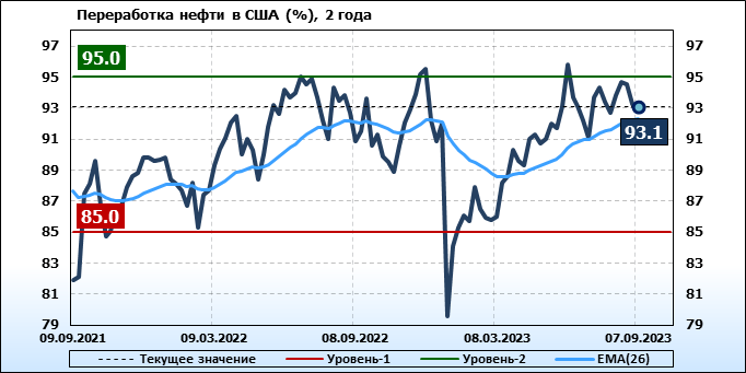 Добыча нефти не изменилась и составляет 12.8 млн. баррелей в день. Импорт нефти вырос на 0.153 до 6.77 млн. баррелей в день. Экспорт нефти вырос на 0.404 до 4.932 млн. баррелей в день. Таким образом, чистый импорт нефти упал на -0.251 до 1.838 млн. баррелей в день. Переработка нефти упала на -0.2 до 93.1 процента.