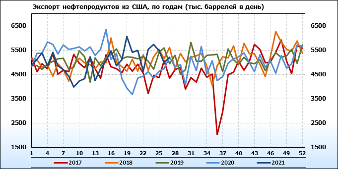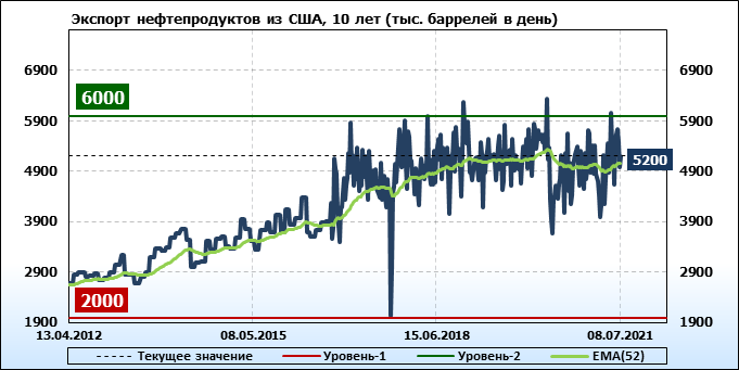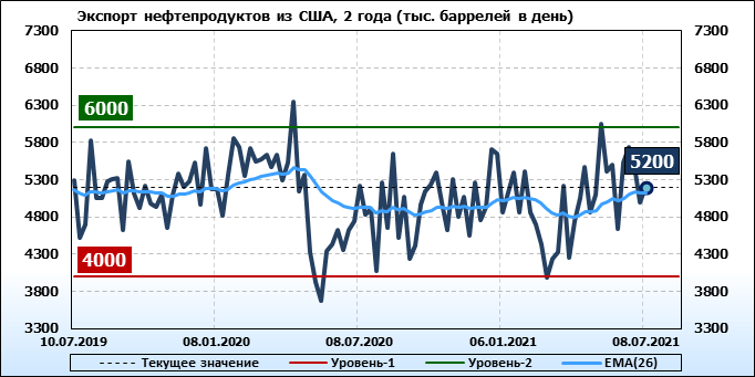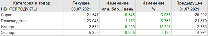 Спрос на нефтепродукты вырос на 0.645 до 21.547 млн. баррелей. Производство нефтепродуктов выросло на 1.173 до 23.043 млн. баррелей. Импорт нефтепродуктов вырос на 0.299 до 2.652 млн. баррелей. Экспорт нефтепродуктов вырос на 0.206 до 5.2 млн. баррелей в день.