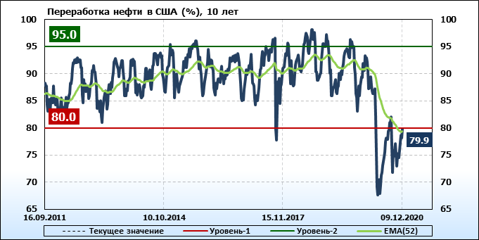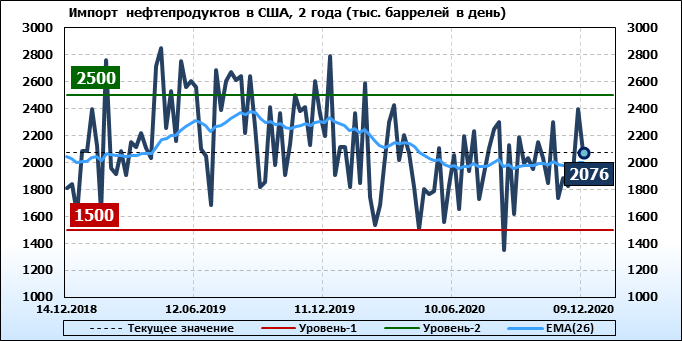 Добыча нефти не изменилась и составляет 11.1 млн. баррелей в день. Импорт нефти вырос на 1.08 до 6.479 млн. баррелей в день. Экспорт нефти упал на -1.622 до 1.834 млн. баррелей в день. Таким образом, чистый импорт нефти вырос на 2.702 до 4.645 млн. баррелей в день. Переработка нефти выросла на 1.7 до 79.9 процента.
