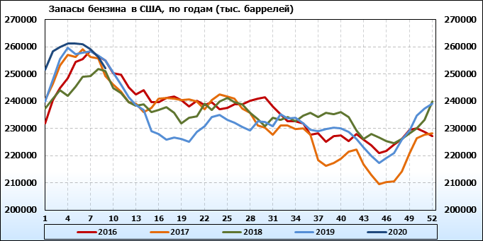 Спрос на нефтепродукты вырос на 1.388 до 21.272 млн. баррелей. Производство дистиллятов выросло на 0.33 до 22.725 млн. баррелей. Импорт дистиллятов вырос на 0.284 до 1.971 млн. баррелей. Экспорт бензина вырос на 0.037 до 5.577 млн. баррелей в день.