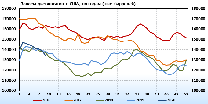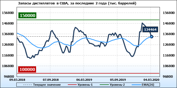 Спрос на дистилляты упал на -0.2 до 3.919 млн. баррелей. Производство дистиллятов упало на -0.198 до 4.648 млн. баррелей. Импорт дистиллятов упал на -0.052 до 0.125 млн. баррелей. Экспорт дистиллятов вырос на 0.221 до 1.427 млн. баррелей в день.