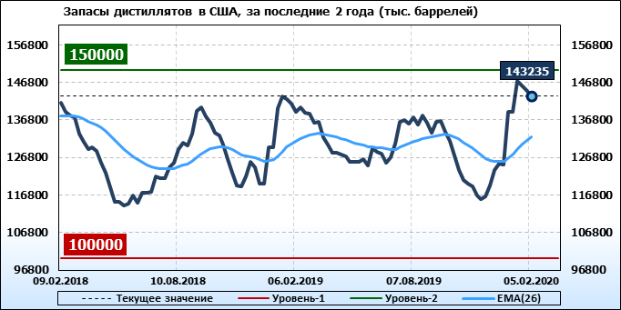Спрос на дистилляты упал на -0.488 до 3.901 млн. баррелей. Производство дистиллятов упало на -0.003 до 4.976 млн. баррелей. Импорт дистиллятов вырос на 0.072 до 0.194 млн. баррелей. Экспорт дистиллятов упал до 0.001175 млн. баррелей в день.