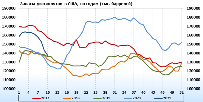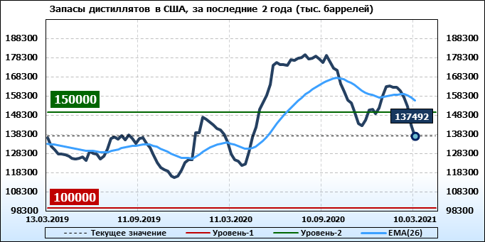 Коммерческие запасы дистиллятов снизились на 5504 тыс. баррелей, достигнув 137,492 млн баррелей.