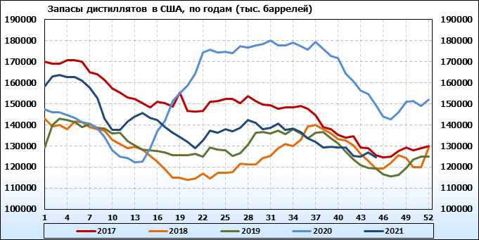 Спрос на дистилляты вырос на 0.594 до 4.28 млн. баррелей. Производство дистиллятов выросло на 0.035 до 4.868 млн. баррелей. Импорт дистиллятов вырос на 0.088 до 0.278 млн. баррелей. Экспорт дистиллятов вырос на 0.211 до 1.239 млн. баррелей в день.