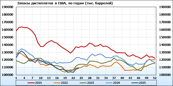 Спрос на дистилляты вырос на 0.225 до 3.376 млн. баррелей. Производство дистиллятов упало на -0.097 до 4.897 млн. баррелей. Импорт дистиллятов упал на -0.062 до 0.104 млн. баррелей. Экспорт дистиллятов вырос на 0.042 до 1.447 млн. баррелей в день.