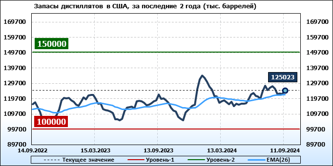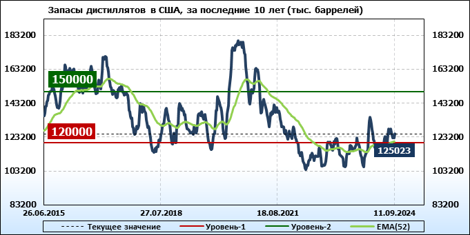 Спрос на дистилляты упал на -0.439 до 3.558 млн. баррелей. Производство дистиллятов выросло на 0.04 до 5.209 млн. баррелей. Импорт дистиллятов вырос на 0.019 до 0.201 млн. баррелей. Экспорт дистиллятов вырос на 0.116 до 1.523 млн. баррелей в день.