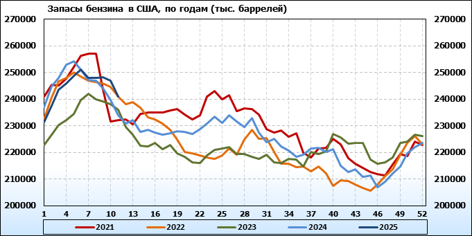 Коммерческие запасы нефти в США выросли на 1.448 до 435.223 млн. баррелей, при прогнозе +2.1 млн. баррелей. Запасы бензина упали на -5.737 до 241.101 млн. баррелей. Запасы дистиллятов упали на -1.559 до 117.595 млн. баррелей. Запасы в хранилище Кушинг упали на -1.228 до 24.469 млн. баррелей.