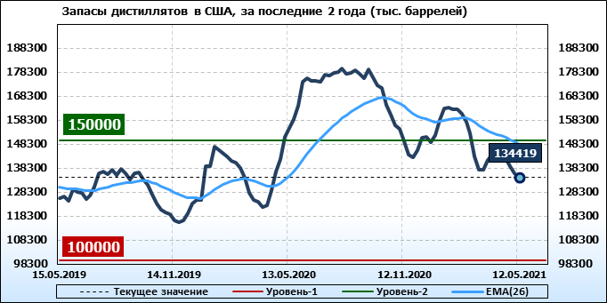 Коммерческие запасы дистиллятов снизились на 1734 тыс. баррелей, достигнув 134,419 млн баррелей.