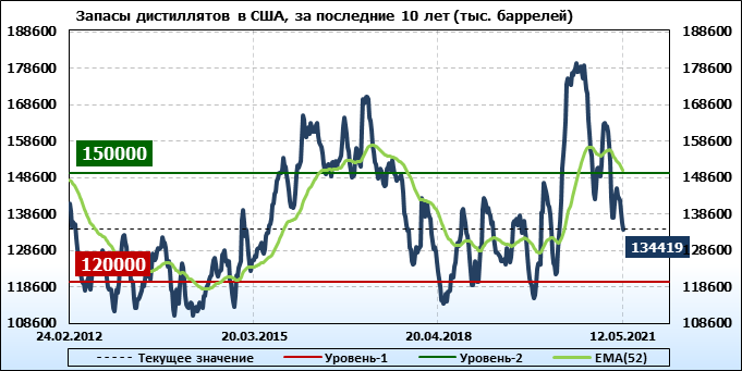 Спрос на дистилляты упал на -0.157 до 3.968 млн. баррелей. Производство дистиллятов выросло на 0.157 до 4.655 млн. баррелей. Импорт дистиллятов вырос на 0.039 до 0.208 млн. баррелей. Экспорт дистиллятов вырос на 0.187 до 1.143 млн. баррелей в день.