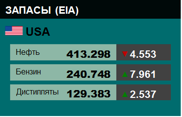 Коммерческие запасы нефти в США упали на -4.553 до 413.298 млн. баррелей, при прогнозе -1.904 млн. баррелей. Запасы бензина выросли на 7.961 до 240.748 млн. баррелей. Запасы дистиллятов выросли на 2.537 до 129.383 млн. баррелей. Запасы в хранилище Кушинг упали на -2.468 до 34.838 млн. баррелей.