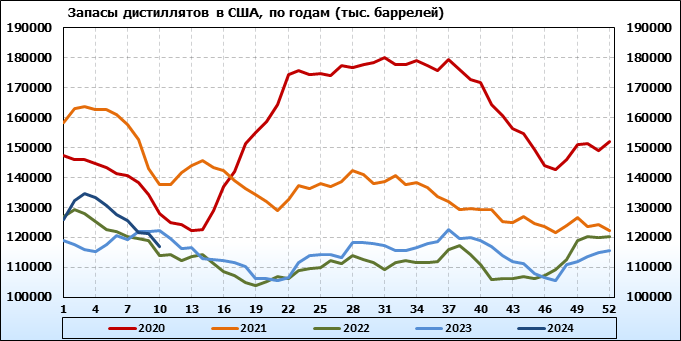 Спрос на дистилляты упал на -0.699 до 3.375 млн. баррелей. Производство дистиллятов выросло на 0.056 до 4.345 млн. баррелей. Импорт дистиллятов упал на -0.024 до 0.171 млн. баррелей. Экспорт дистиллятов вырос на 0.176 до 1.231 млн. баррелей в день.