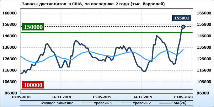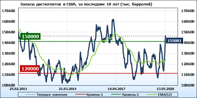 Коммерческие запасы дистиллятов поднялись на 3511 тыс. баррелей, достигнув 155,001 млн баррелей.