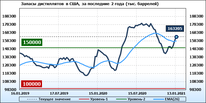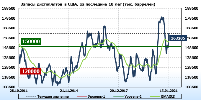 Коммерческие запасы дистиллятов поднялись на 4786 тыс. баррелей, достигнув 163,205 млн баррелей.