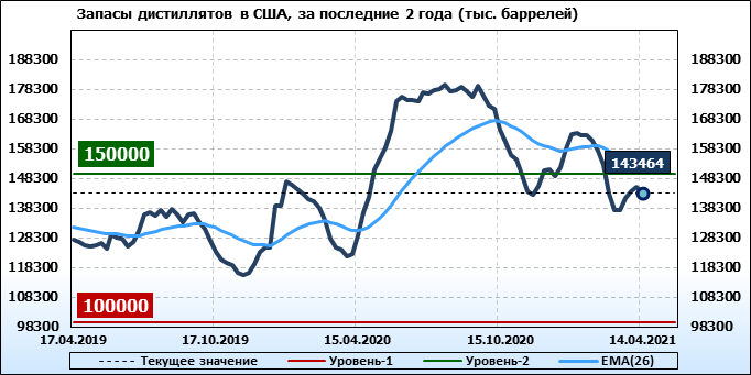Коммерческие запасы дистиллятов снизились на 2083 тыс. баррелей, достигнув 143,464 млн баррелей.