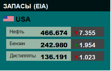 Коммерческие запасы нефти в США упали на -7.355 до 466.674 млн. баррелей, при прогнозе -3.290 млн. баррелей. Запасы бензина выросли на 1.954 до 242.98 млн. баррелей. Запасы дистиллятов упали на -1.023 до 136.191 млн. баррелей. Запасы в хранилище Кушинг упали на -2.15 до 43.554 млн. баррелей.
