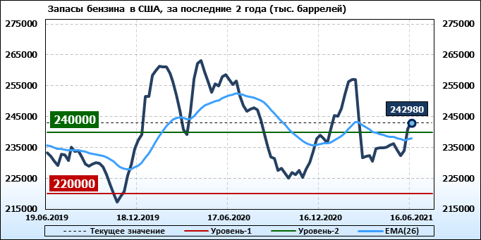 Спрос на бензин вырос на 0.88 до 9.36 млн. баррелей в день. Производство бензина выросло на 0.495 до 9.926 млн. баррелей в день. Импорт бензина не изменился и остался на уровне 1.05 млн. баррелей в день. Экспорт бензина упал на -0.122 до 0.835 млн. баррелей в день.