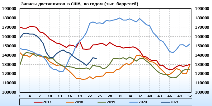 Коммерческие запасы дистиллятов снизились на 1023 тыс. баррелей, достигнув 136,191 млн баррелей.