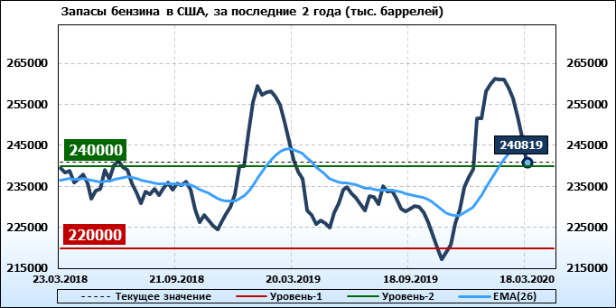 Спрос на бензин вырос на 0.247 до 9.696 млн. баррелей в день. Производство бензина выросло на 0.018 до 9.974 млн. баррелей в день. Импорт бензина упал на -0.022 до 0.688 млн. баррелей в день. Экспорт бензина упал на -0.142 до 0.603 млн. баррелей в день.