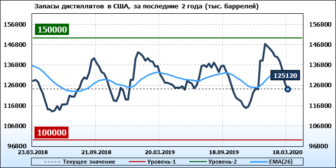 Спрос на дистилляты упал на -0.385 до 4.013 млн. баррелей. Производство дистиллятов упало на -0.019 до 4.686 млн. баррелей. Импорт дистиллятов упал на -0.045 до 0.263 млн. баррелей. Экспорт дистиллятов упал на -0.174 до 1.356 млн. баррелей в день.