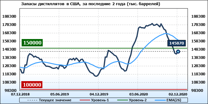 Коммерческие запасы дистиллятов поднялись на 3238 тыс. баррелей, достигнув 145,87 млн баррелей.