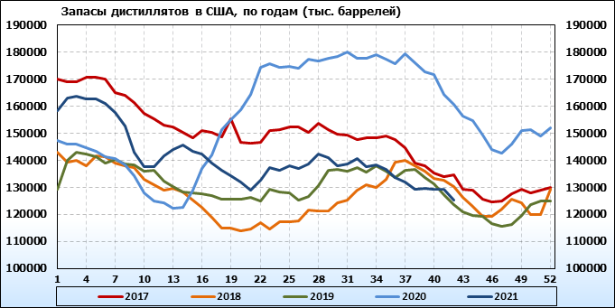 Спрос на дистилляты вырос на 0.346 до 4.278 млн. баррелей. Производство дистиллятов упало на -0.289 до 4.417 млн. баррелей. Импорт дистиллятов вырос на 0.012 до 0.202 млн. баррелей. Экспорт дистиллятов упал на -0.068 до 0.9 млн. баррелей в день.