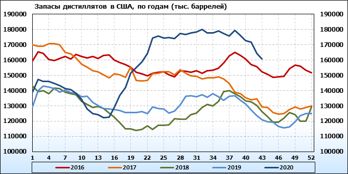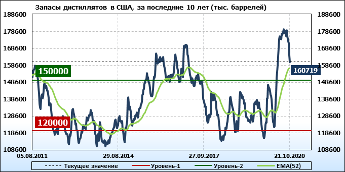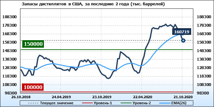 Коммерческие запасы дистиллятов снизились на 3832 тыс. баррелей, достигнув 160,719 млн баррелей.