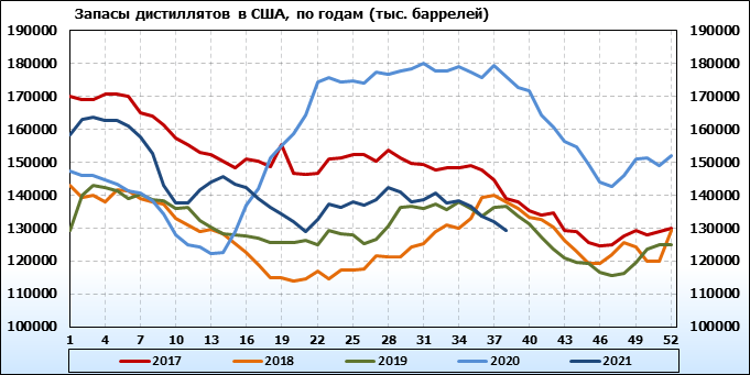 Спрос на дистилляты вырос на 0.629 до 4.424 млн. баррелей. Производство дистиллятов выросло на 0.298 до 4.454 млн. баррелей. Импорт дистиллятов вырос на 0.02 до 0.184 млн. баррелей. Экспорт дистиллятов упал на -0.188 до 0.579 млн. баррелей в день.