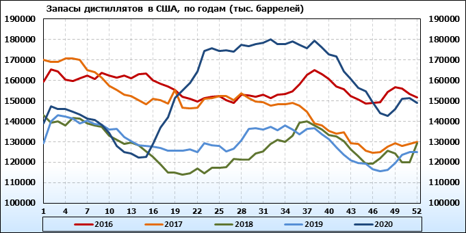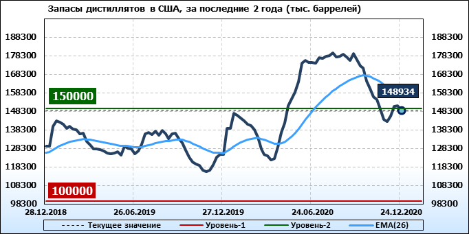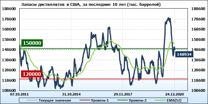 Коммерческие запасы дистиллятов снизились на 2325 тыс. баррелей, достигнув 148,934 млн баррелей.