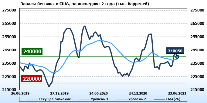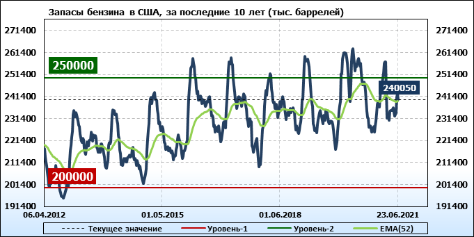 На прошлой неделе состоялись техническая встреча и заседание министерского мониторингового комитета ОПЕК+, где обсуждалось состояние нефтяного рынка и мировой экономики. 1 июля министерский комитет ОПЕК+ определит параметры сделки по добыче нефти после июля 2021 г. По данным Reuters со ссылкой на источник в ОПЕК, соблюдение соглашения по ограничению добычи нефти участниками ОПЕК+ в мае составило 115% (114% в апреле). 10 стран ОПЕК выполнили сделку на 124%, страны вне ОПЕК – на 94%. Представители ОПЕК также провели встречи, посвященные добыче нефти в США, и изучили прогнозы ведущих мировых аналитических агентств. По данным Reuters со ссылкой на EIA, добыча нефти в США на основных сланцевых формациях в июле 2021 г. может вырасти до 7,8 млн барр. в сутки (мбс).