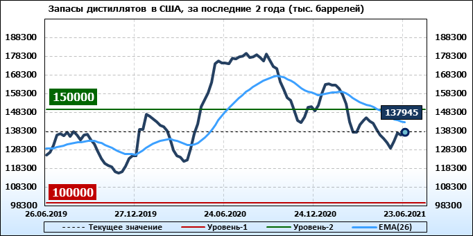 Коммерческие запасы дистиллятов поднялись на 1754 тыс. баррелей, достигнув 137,945 млн баррелей.