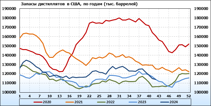 Спрос на дистилляты упал на -0.081 до 4.131 млн. баррелей. Производство дистиллятов выросло на 0.257 до 5.011 млн. баррелей. Импорт дистиллятов упал на -0.027 до 0.105 млн. баррелей. Экспорт дистиллятов упал на -0.031 до 1.148 млн. баррелей в день.