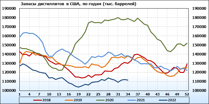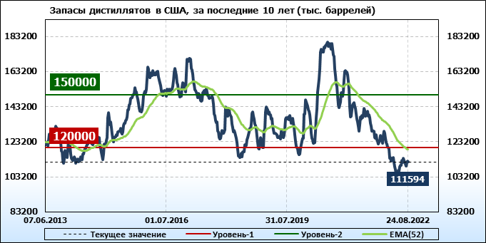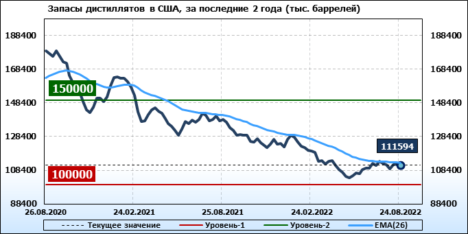 Спрос на дистилляты упал на -0.037 до 3.888 млн. баррелей. Производство дистиллятов выросло на 0.022 до 5.2 млн. баррелей. Импорт дистиллятов вырос на 0.009 до 0.173 млн. баррелей. Экспорт дистиллятов вырос на 0.271 до 1.579 млн. баррелей в день.
