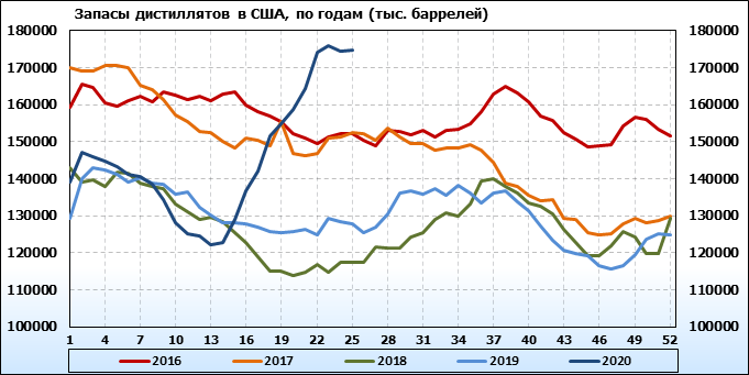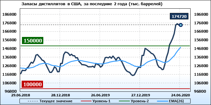 Спрос на дистилляты упал на -0.089 до 3.466 млн. баррелей. Производство дистиллятов выросло на 0.063 до 4.561 млн. баррелей. Импорт дистиллятов упал на -0.094 до 0.069 млн. баррелей. Экспорт дистиллятов упал на -0.173 до 1.128 млн. баррелей в день.