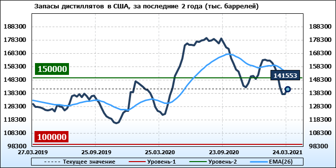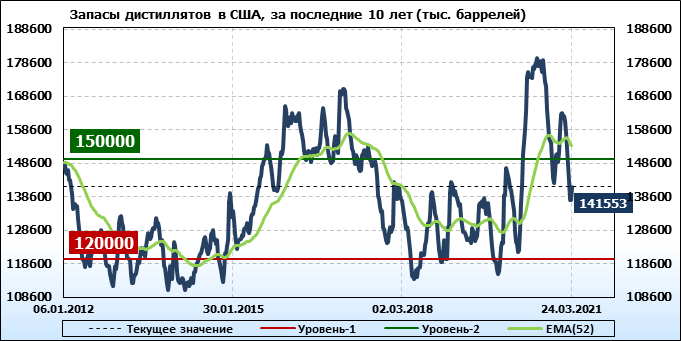 Коммерческие запасы дистиллятов поднялись на 3806 тыс. баррелей, достигнув 141,553 млн баррелей.