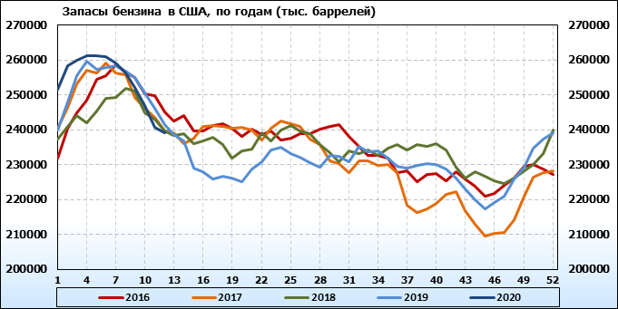 Спрос на бензин упал на -0.859 до 8.837 млн. баррелей в день. Производство бензина упало на -1.016 до 8.958 млн. баррелей в день. Импорт бензина вырос на 0.146 до 0.834 млн. баррелей в день. Экспорт бензина вырос на 0.232 до 0.835 млн. баррелей в день.