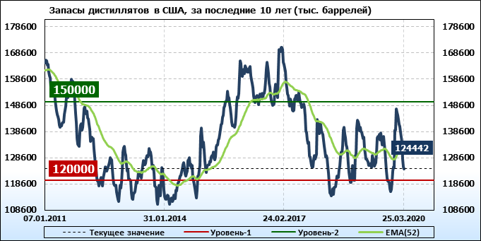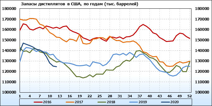 Спрос на дистилляты упал на -0.218 до 3.795 млн. баррелей. Производство дистиллятов выросло на 0.152 до 4.838 млн. баррелей. Импорт дистиллятов упал на -0.148 до 0.115 млн. баррелей. Экспорт дистиллятов упал на -0.1 до 1.256 млн. баррелей в день.