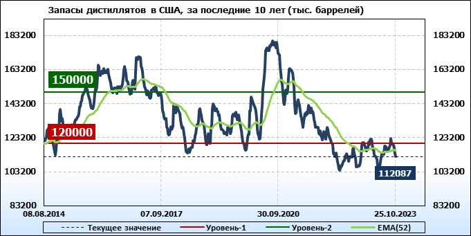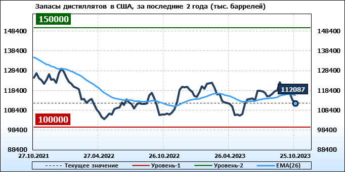 Спрос на дистилляты упал на -0.347 до 4.069 млн. баррелей. Производство дистиллятов выросло на 0.039 до 4.733 млн. баррелей. Импорт дистиллятов вырос на 0.039 до 0.116 млн. баррелей. Экспорт дистиллятов вырос на 0.081 до 0.225 млн. баррелей в день.